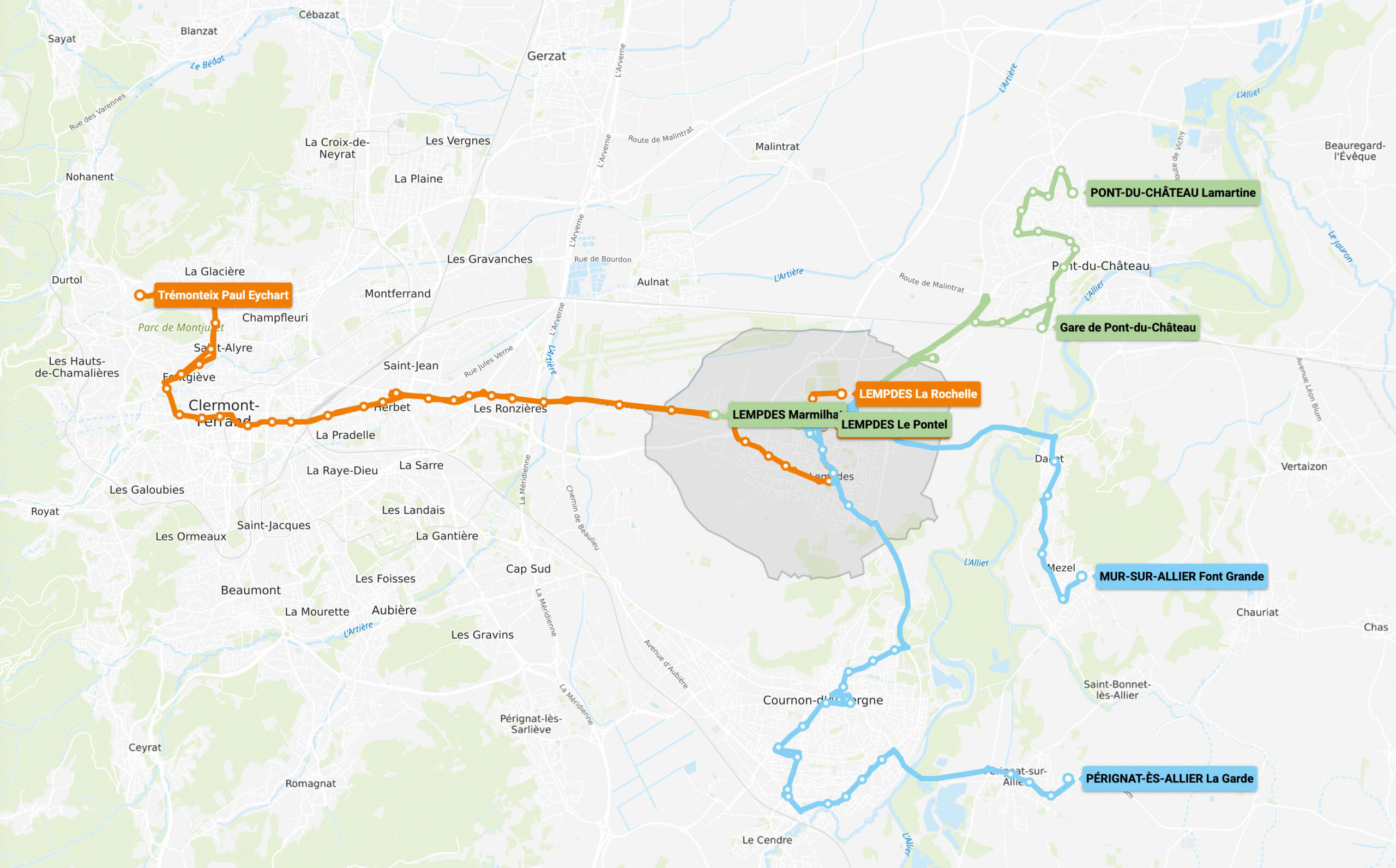 - correspondances directes avec les gares ferroviaires de Clermont-Ferrand, Cournon d’Auvergne, Gerzat ou Pont-du-Château,