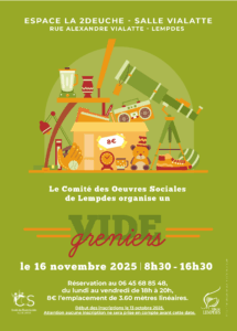 Le Comité des Oeuvres sociales de Lempdes organise un vide-greniers le 16 novembre 2025, de 8h30 à 16H30, salle Alexandre Vialatte (2Deuche). Emplacement de 3,60 mètres linéaires : 8 €